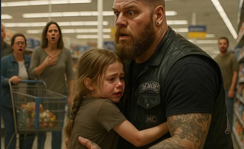 Then, in what seemed like a desperate gesture, she rushed towards the biggest man in the store. A giant, fully covered in tattoos, wearing a leather vest with the words “Demons MC” written on it. The scene instantly created a chill: customers stepped aside, mothers pulled their children closer, the air thickened. Everyone expected a violent scene.