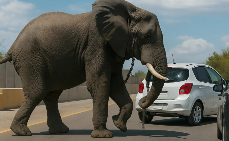 Under the scorching sun, traffic suddenly came to a halt. Drivers were honking, some leaning out of their windows — in the middle of the road stood a massive elephant. It flapped its ears nervously and suddenly struck a white car with its trunk. The bumper cracked, people panicked, tried to reverse, some screamed, others filmed everything on their phones.