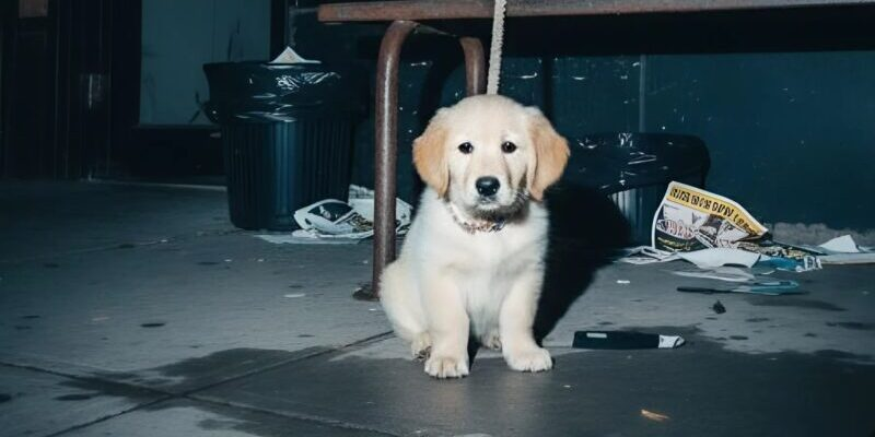 The street was dark and empty, lined with shuttered shops, broken glass, and old flyers stuck to the ground. That’s when I saw her. A tiny golden retriever puppy, no bigger than a shoebox, tied to a rusty bench with a frayed rope.