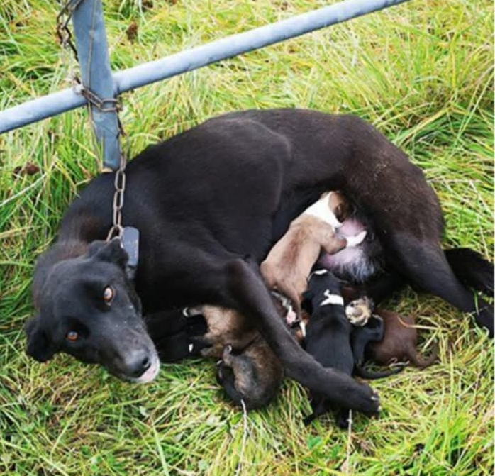 In a remote field, a two-year-old lurcher dog was found tightly chained to a metal fence post. Nearby, her six newborn puppies, too young to open their eyes, lay without food or water.
